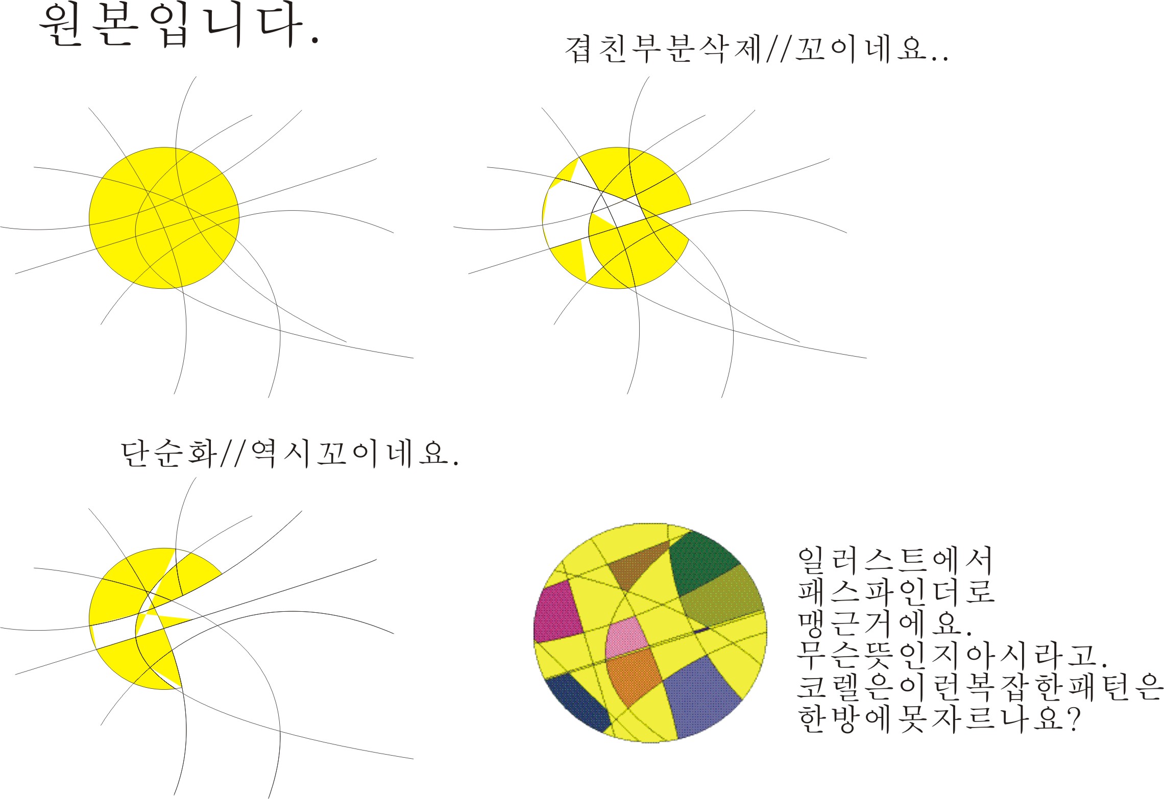 간단한 개체나누기 .. 뭐 원을 두개로 나누는건 단순화버튼 내지 겹친부분삭제를통해서 어떻게든 하겠는데 복잡한건 도통 꼬인다고나할까요.. 일러스트만큼은 잘 돼주지가 않는거같네요.. 본인실력이 부족한듯..